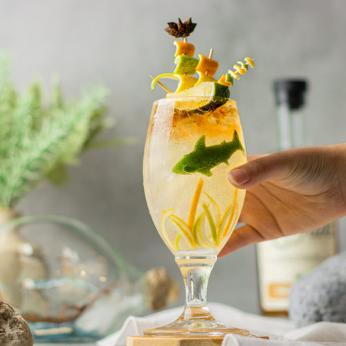 Place the seaweed and shark in the glass held horizontally and weigh it down with crushed ice. When this is substantially secure, rotate the glass to be vertical and continue filling with crushed ice.