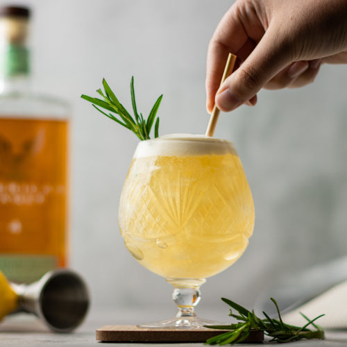 Pour the froth over the cocktail and garnigh with a sprig of rosemary.